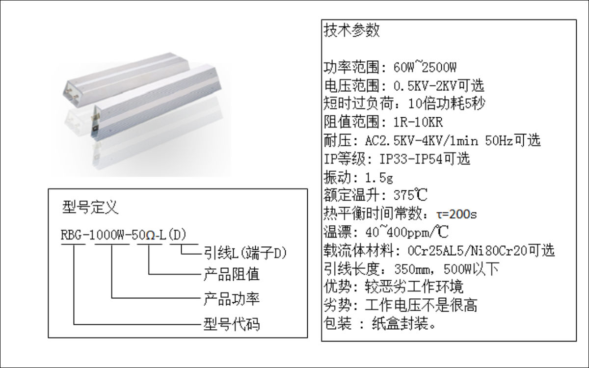 本品为RLG系列电阻器其耐气候性,耐振动,安全性,优于传统瓷骨架电阻器。广泛应用于电源,变频器,伺服系统等高要求的电气回路中,并能够用于恶劣的工控环境。易紧密安装,易附加散热器。外型美观,是电力电子理想的配套产品。