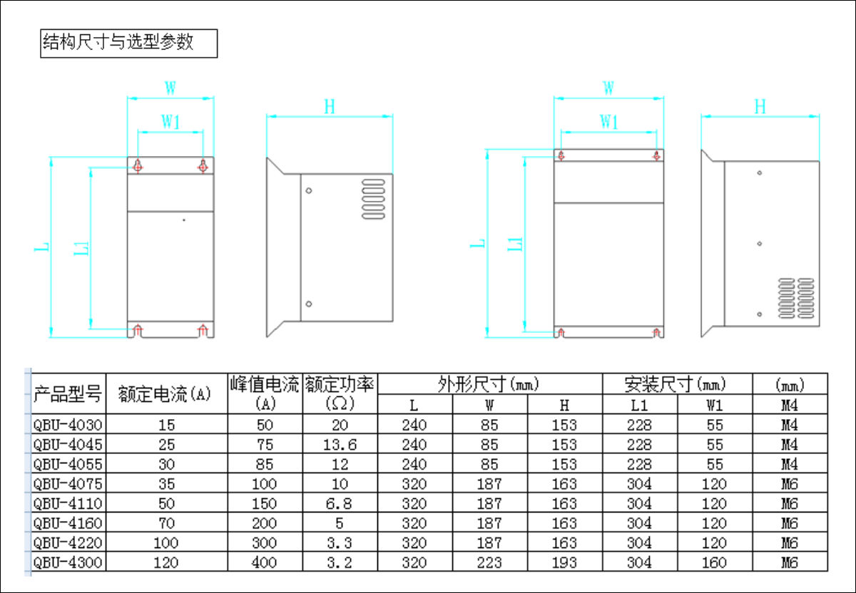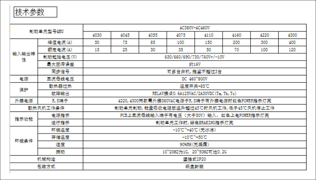 QBU系列制动单元的作用是将马达在减速的过程中产生的再生能量,以热能的形式消耗在制动电阻上,从而改善变频器的制动性能及缩短变频器的制动时间。